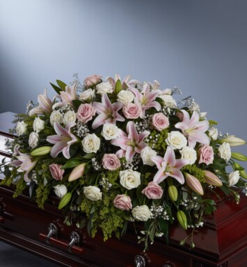 Ramo floral del cofre ” lirios rosados,rosas blancas y rosadas “