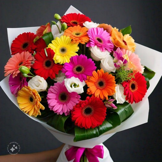 “Una abundante explosión de gerberas multicolor que irradia felicidad y energía. Perfecto para llenar cualquier espacio de vitalidad y optimismo, ideal para celebrar la vida o simplemente para alegrar el día.”